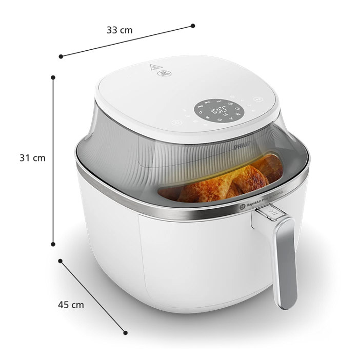 با ظرفیت 7.2 لیتری، این دستگاه برای خانواده‌های متوسط و بزرگ ایده‌آل است. طراحی آن با رنگ سفید شیک و ابعاد جمع‌وجور (303.5 × 333 × 453 میلی‌متر) زیبایی بصری آشپزخانه شما را تکمیل می‌کند. با توان بالا و عملکرد کارآمد انرژی، فیلیپس HD9270 یک سرمایه‌گذاری بلندمدت بر روی سلامت و راحتی در آشپزی است.